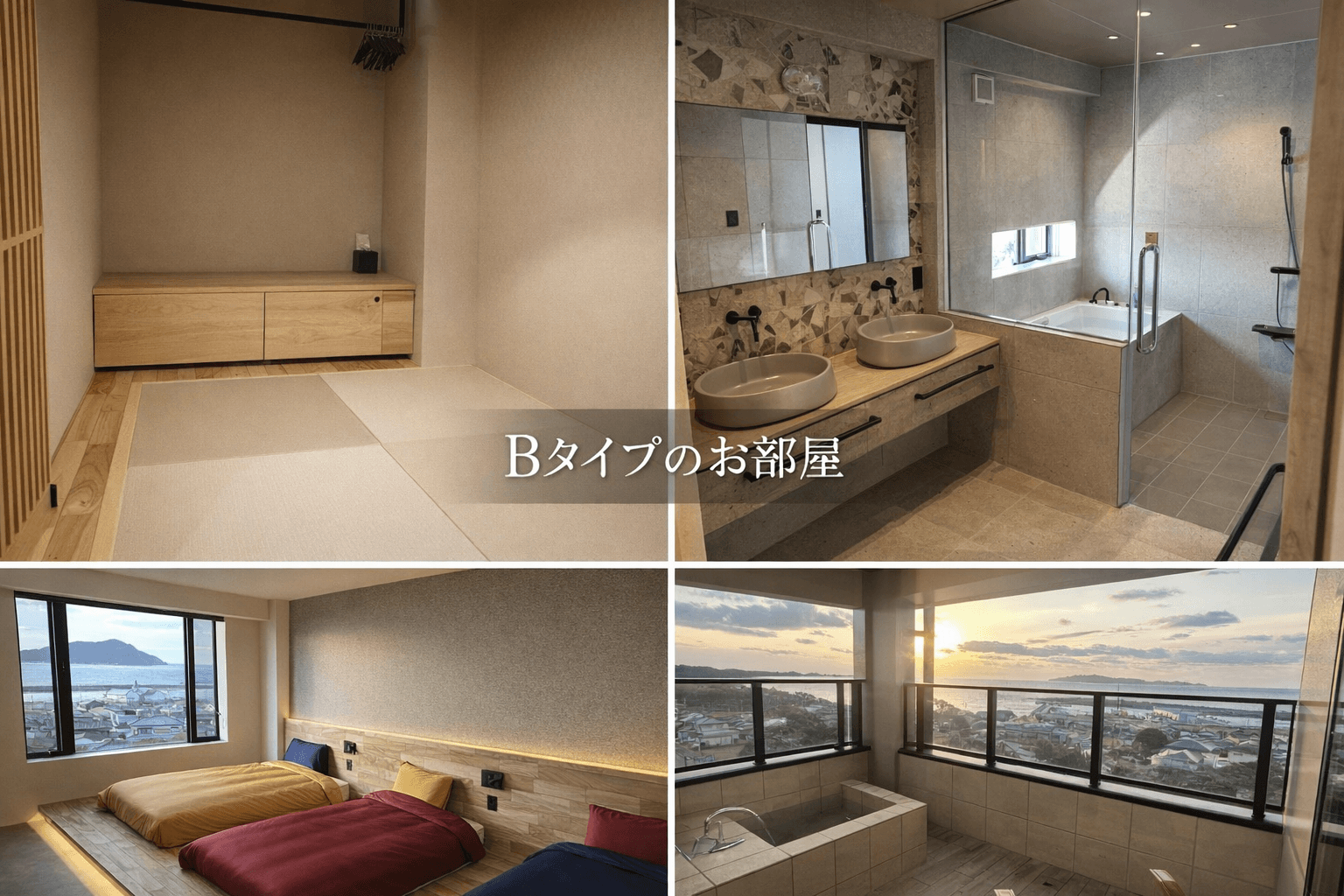 全室から玄界灘の海が一望でき、展望露天風呂やペントハウス風テラスなど、ご利用目的に合わせてリラックスできる空間を提供しております。